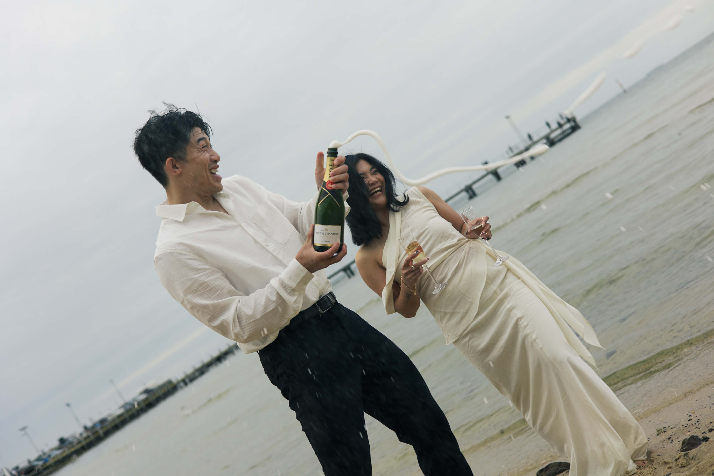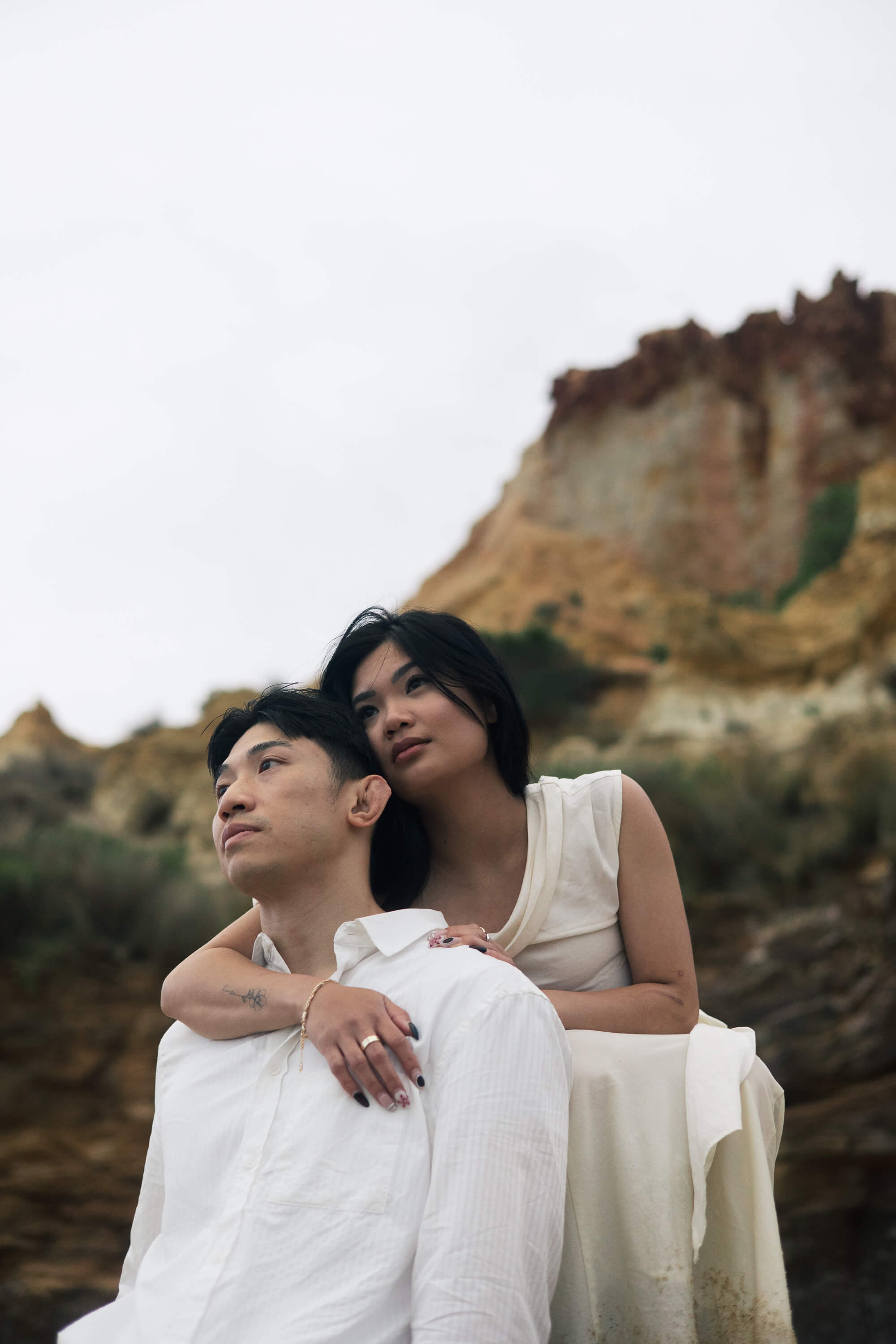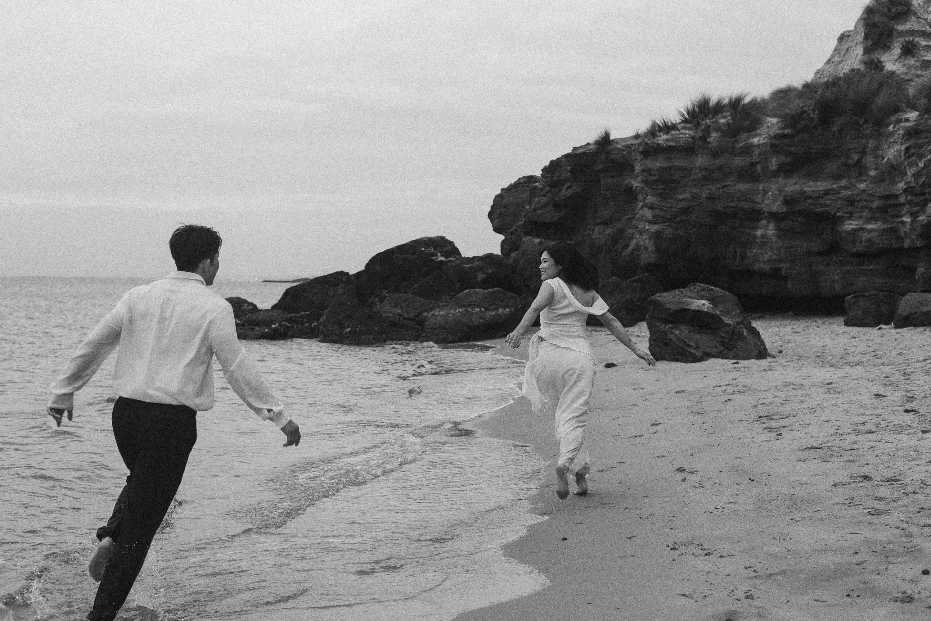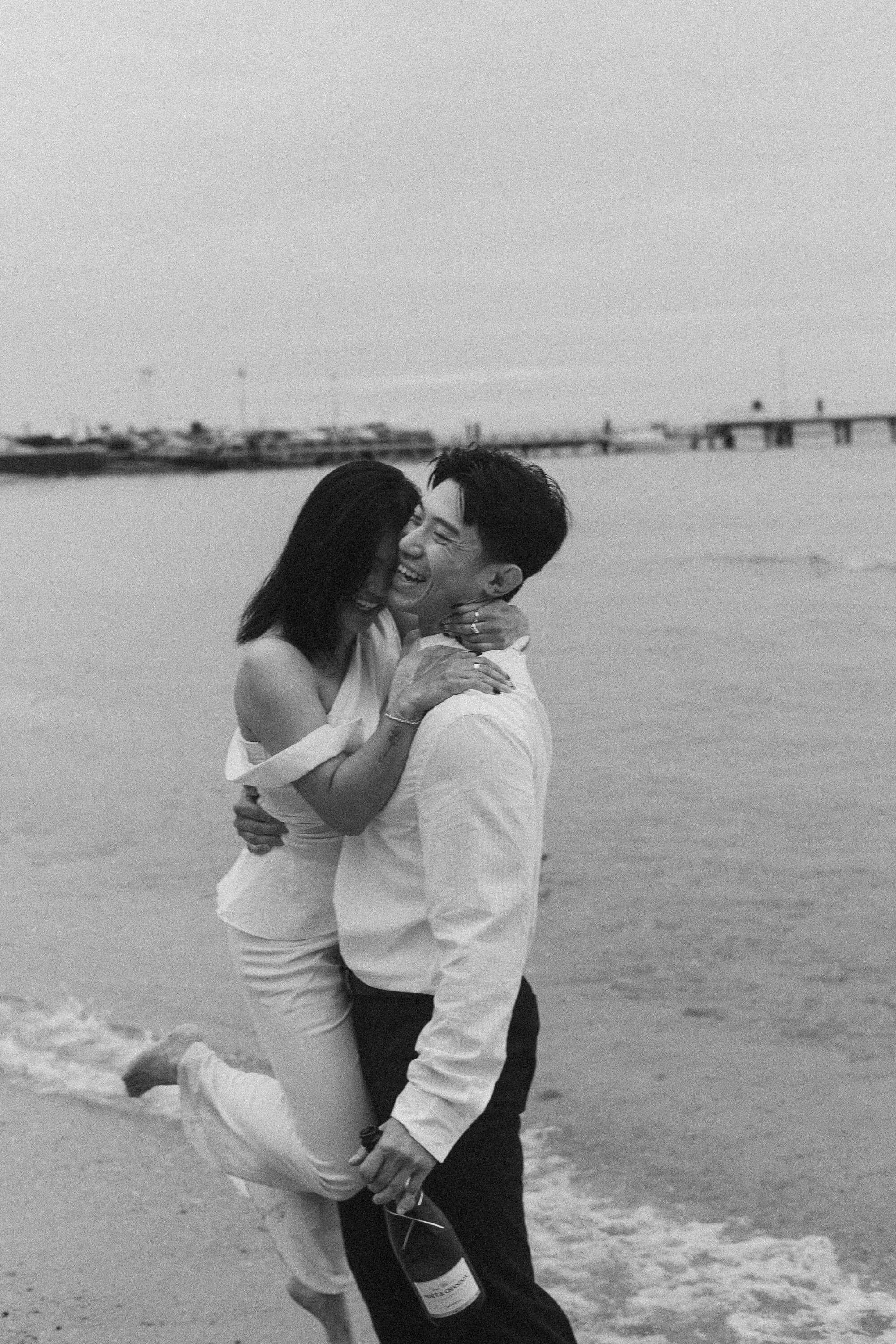 A relaxed engagement session photographed on the Melbourne coastline. Real moments, quietly captured
